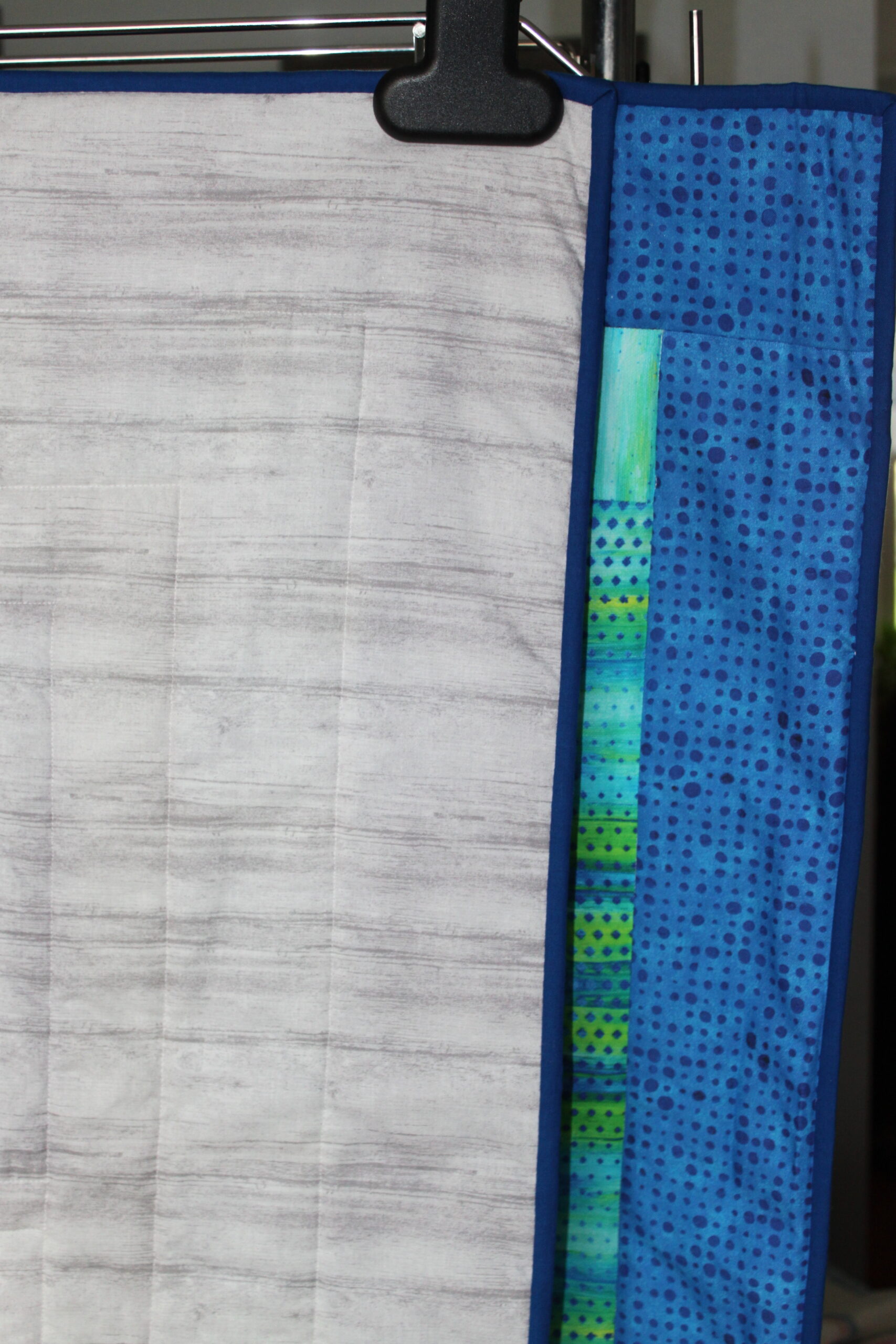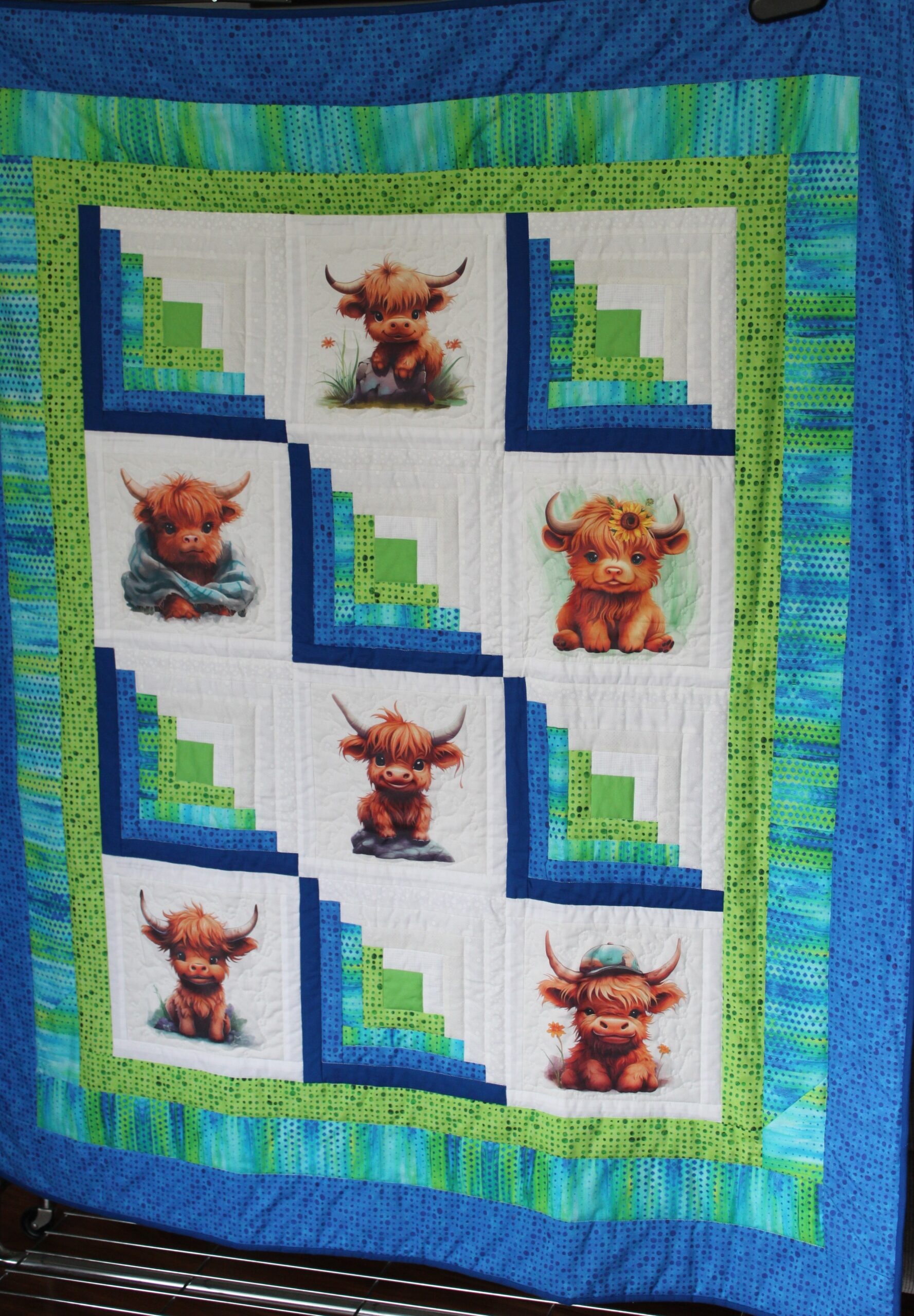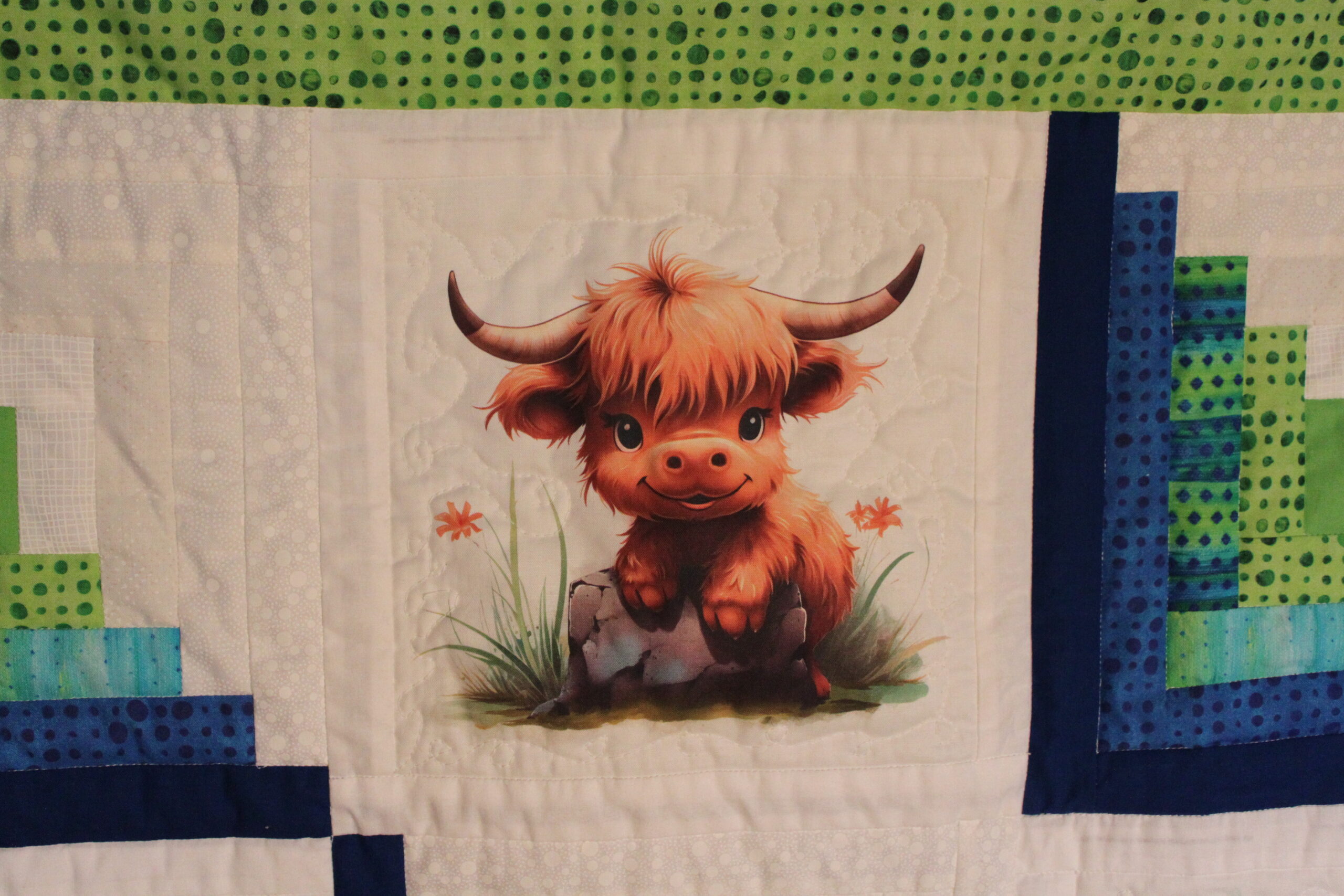This handmade baby quilt has a warm, homespun charm that feels both comforting and thoughtfully crafted. At its center are soft fabric blocks printed with Highland cows—each one featuring those endearing, shaggy-coated animals with gentle expressions. The prints bring a playful, countryside character to the quilt, giving it a sweet, storybook quality perfect for a nursery.